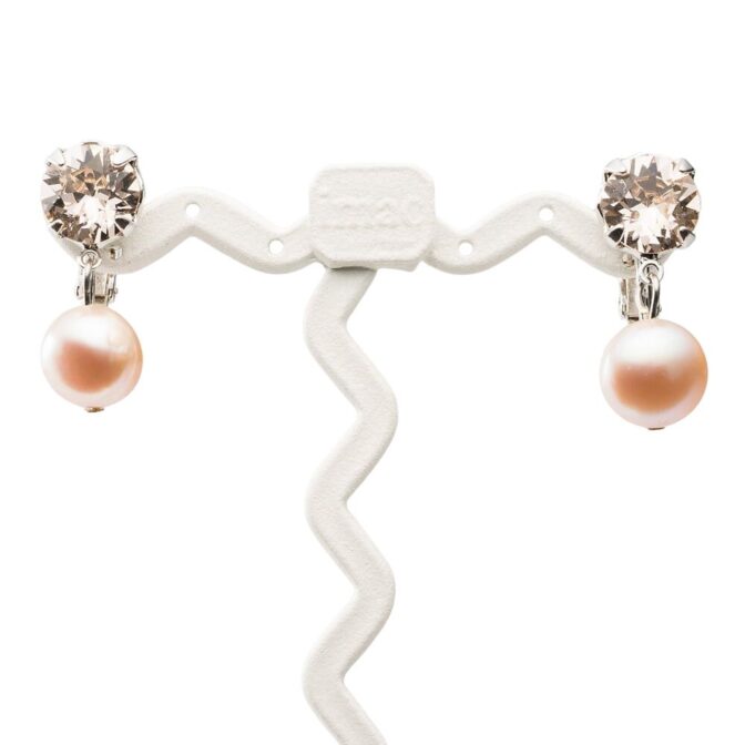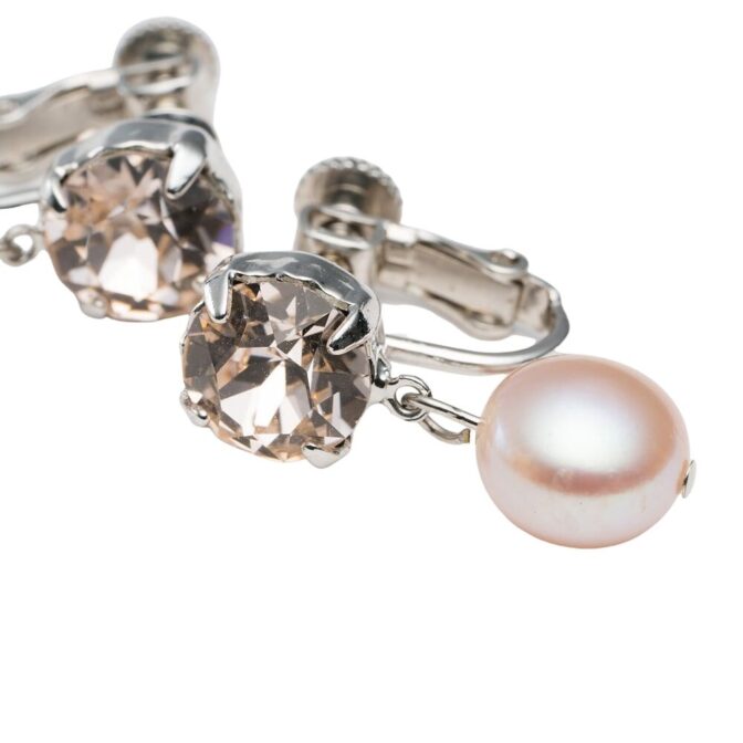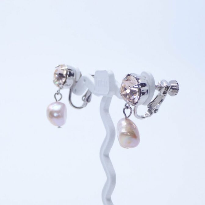 優しいピンクの淡水パールとスワロフスキークリスタルの組み合わせが上品なイヤリング。