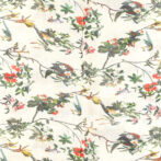 生成り地にグリーンやレッドの植物柄をあしらい、シックな印象です。