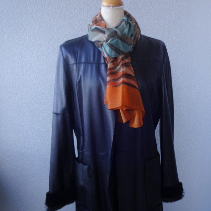ジオメトリック(幾何)模様がプリントされたロングスカーフ。