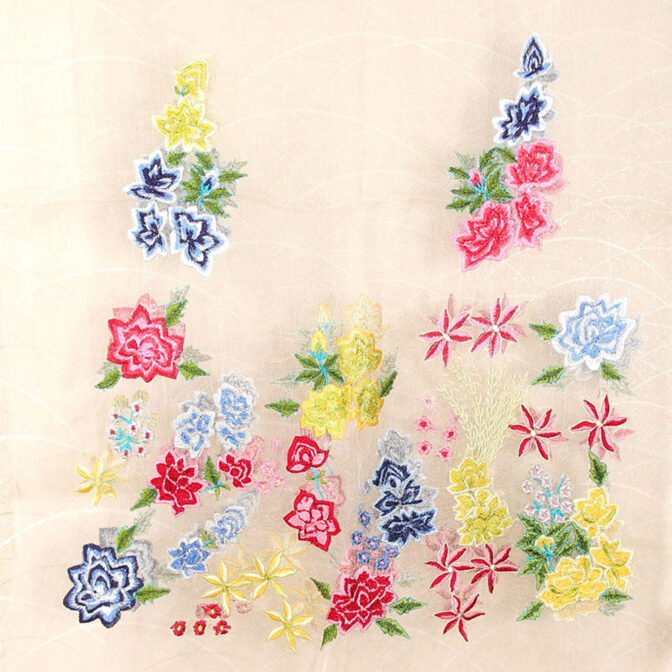 レッド、ブルー、ピンク、イエロー等色とりどりの花モチーフが女性らしさを演出します。