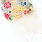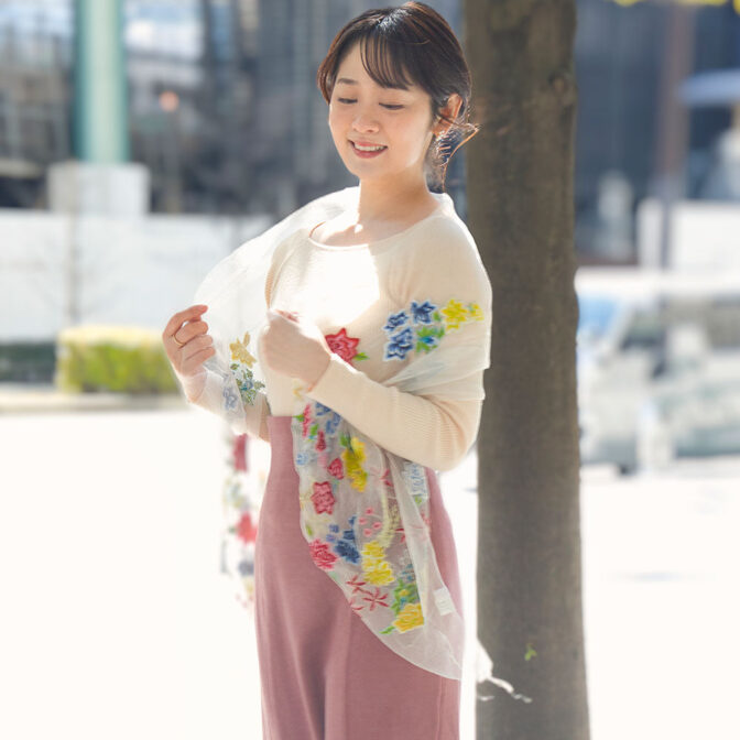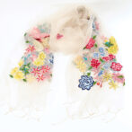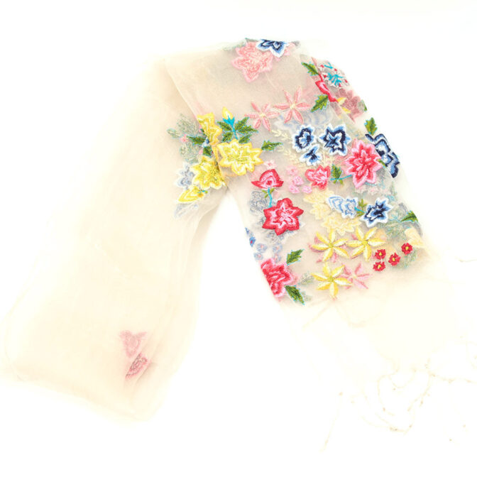 ホワイトのシルク地にフラワーの刺繍をあしらったロングスカーフ。