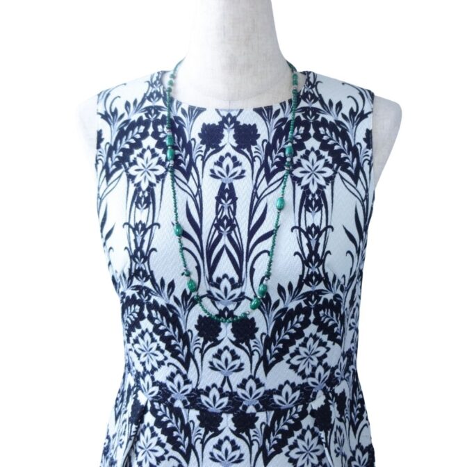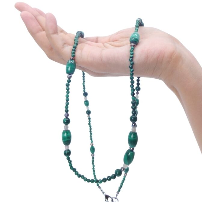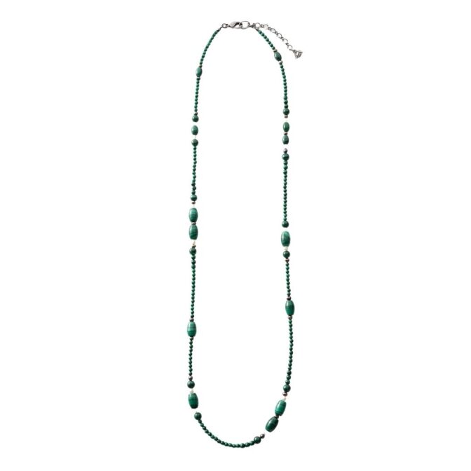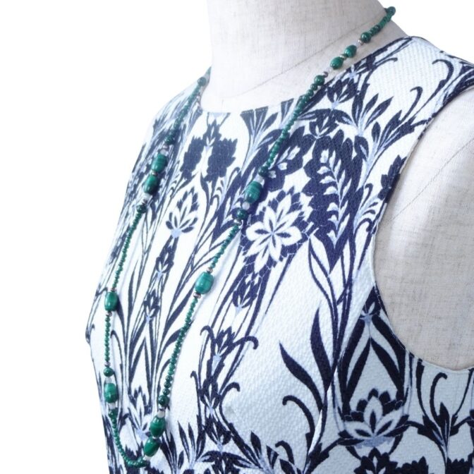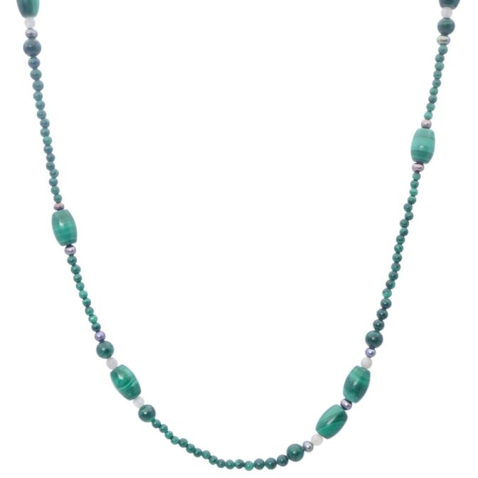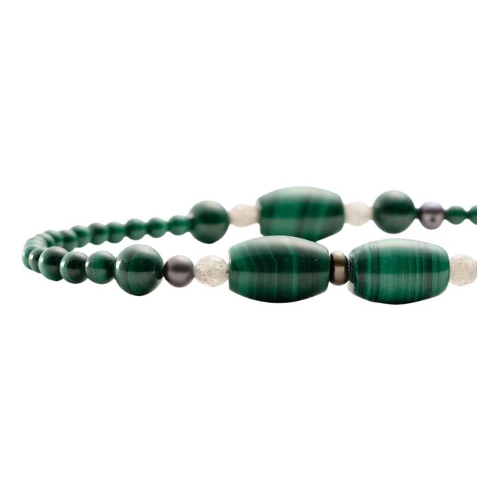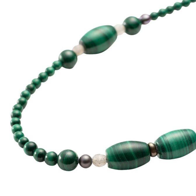 マラカイトと淡水パール、ラブラドライトを組み合わせたロングネックレス。